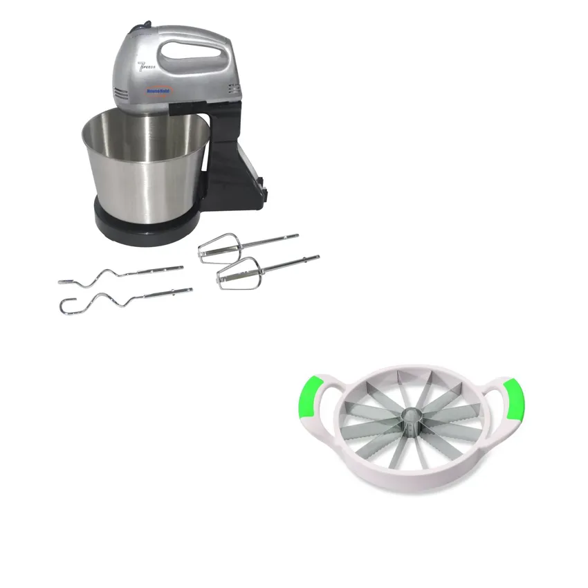 เครื่องตีไข่, HHsociety เครื่องผสมอาหาร รุ่น HM-202 + HHsociety ที่ผ่าผลไม้ Fruit Slicer (สีเขียว) ชนิดของเครื่องตีหรือเครื่องผสมอาหาร ถ้าเดินไปแผนกเครื่องใช้ไฟฟ้าแล้วมองหาเครื่องผสมอาหารจะพบว่ามีหลายยี่ห้อและมีหน้าตาหลายแบบมาก แต่ไม่ต้องตกใจหนึ่งเพราะไม่ว่าจะหน้าตาแบบไหน แต่สุดท้ายเครื่องผสมอาหารมีอยู่ไม่กี่ชนิด หนึ่งขอขอแบ่งตามลักษณะการใช้งาน มี 2 ชนิดคือ Hand mixer หรือเครื่องตีแบบมือถือ มีขนาดเล็ก น้ำหนักเบา ถือไปมาได้สะดวก จะมาแต่ตัวเครื่องและหัวตี ไม่มีโถผสมมาให้ หัวตีที่ให้มาแล้วแต่ยี่ห้อ แล้วแต่รุ่น บางรุ่นให้แค่อย่างเดียว บางรุ่นก็จัดเต็มหัวตีมาทุกแบบ มี blender แบบใบมีดมาให้ด้วยซึ่งแน่นอนว่าราคาก็จะสูงขึ้นด้วย รุ่นมือเดี่ยวตัวเล็กมาก เหมาะสำหรับตีฟองนมแบบเล็กๆ ที่ร้านกาแฟนิยมใช้ สามารถใช้ตีไข่ได้เหมือนกันแต่ต้องเป็นปริมาณน้อยๆ (ลองคิดถึงอาหารฝรั่งเศสที่เสิร์ฟมาแล้วมีฟองๆ ใช้ตัวนี้แหละค่ะตี) แบบกึ่งมือถือ ตัวนี้จริงๆแล้วคือ hand mixer ที่มีแท่นเพิ่มให้นั่นเอง เผื่อว่าไม่อยากถือตีตลอดเวลก็มีแป้นให้วางและมีโถตีให้ด้วย แถมมี option ให้เลือกด้วยว่าโถหมุนได้ หมุนไม่ได้ด้วย เครื่องตีแบบนี้เป็นเครื่องตีตัวแรกที่หนึ่งซื้อมาใช้ด้วย Stand Mixer หรือ เครื่องผสมแบบตั้งโต๊ะ เครื่องตีแบบนี้จะมาแบบ strong และแน่นมากค่ะ เครื่องมีขนาดใหญ่ น้ำหนักเยอะมาก วางแล้ววางเลย เคลื่อนย้ายไปมาลำบาก และราคาสูงกว่าสองแบบข้างต้น แต่จะมีกำลังมากกว่า ปรับความเร็วได้หลายระดับ มาพร้อมโถและหัวตีแบบต่างๆ ที่ออกแบบมาเฉพาะคือใช้ได้กับเครื่องนั้นเท่านั้น ราคาเครื่องตีแบบนี้มีตั้งแต่หลักหลายพันถึงหลายหมื่นแล้วแต่นี่ห้อ บ้านเรามีหลายยี่ห้อ เราแนะนำ