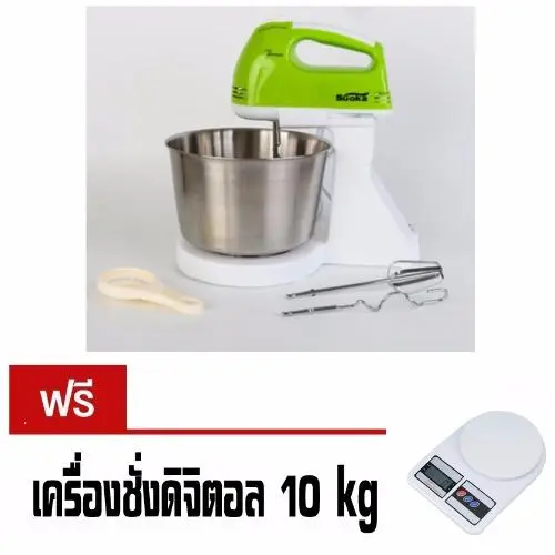 เครื่องผสมอาหาร 5ลิตร, Suoka เครืองผสมอาหาร เครื่องผสมแป้ง เครื่องทำขนม(Green)(Green) เครื่องตีหรือเครื่องผสมอาหาร เรียกแบบนี้อาจจะไม่ค่อยคุ้นหู แต่ถ้าหนึ่งเรียก “เครื่องตีไข่” ทุกคนต้องร้องอ๋อ แต่หนึ่งจะไม่เรียก “เครื่องตีไข่” เพราะความหมายเขาแคบไปอาจจะทำให้เข้าใจผิดกันได้ เพราะจริงๆแล้วเครื่องตีหรือเครื่องผสมอาหารใช้ทำอะไรได้หลายอย่างมากกว่าตีไข่และมีหลายแบบให้เลือกซื้อมา มือใหม่หัดอบขนมที่กำลังคิดหรือตัดสินใจอยู่ว่าอ่านก่อนตัดสินใจเลือกซื้อ โดยเขียนจากประสบการณ์การใช้งานเน้นทำกินเองในบ้าน ไม่รวมแบบทำเป็นอุตสาหกรรมว่ามีอะไรที่ควรรู้ก่อนเดินไปซื้อมาใช้และควรเลือกซื้อเครื่องผสม/เครื่องตีไข่แบบไหนดี ก่อนอื่นมารู้จักเจ้า “เครื่องตีหรือเครื่องผสมอาหาร” กันก่อนว่ามันคืออะไร เครื่องตีหรือเครื่องผสมอาหาร หรือ Mixer คืออะไร ใช้ทำอะไร เป็นเครื่องใช้ไฟฟ้าในครัวที่ใช้ผสมหรือตีส่วนผสมอาหารเข้าด้วยกันด้วยแรงจากมอเตอร์ สามารถปรับระดับความเร็วในการตีหรือการผสมได้หลายระดับแล้วแต่เครื่อง (เครื่องผสมอาหารหรือ mixer จะไม่มีการบดอาหาร ถ้ามีการบดอาหารจะอยู่ในกลุ่ม blender ที่มีหัวตีคล้ายใบมีด) mixer ในงานขนมอบเราใช้ตีไข่ ตีเมอแรง ตีวิปปิ้งครีม ตีเนย ตีส่วนผสมของเค้ก(cake batter) หรือแม้ผสมแป้งโดสำหรับทำคุกกี้หรือเพสทรีต่างๆ เราแนะนำ