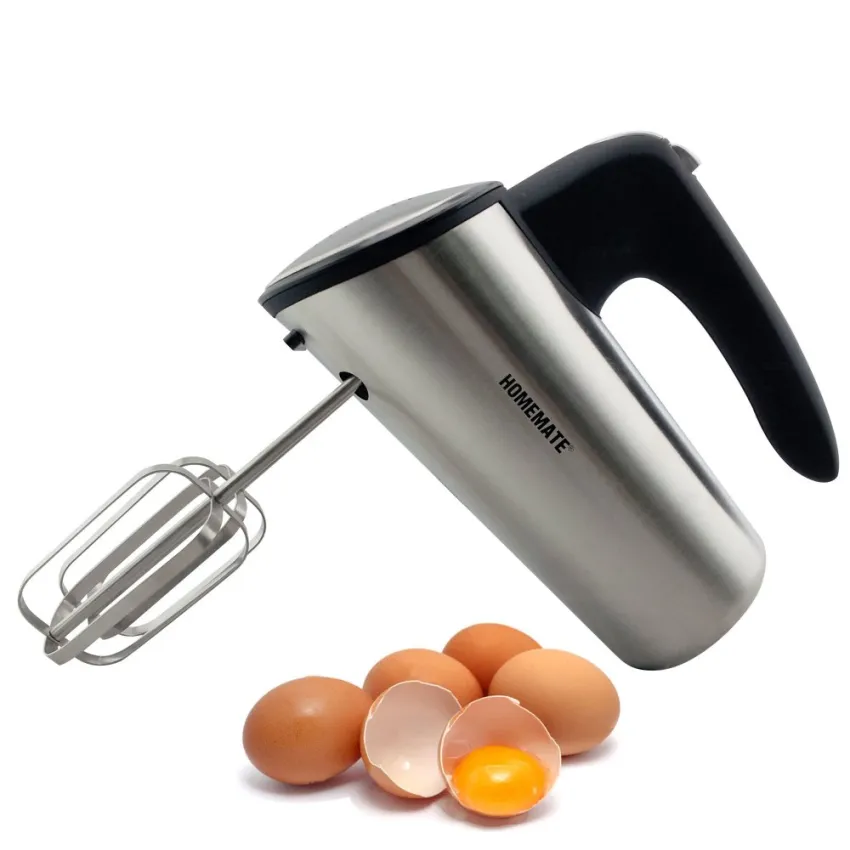 เครื่องตีไข่, Homemate เครื่องตีไข่ รุ่น HOM-12KP81 (Silver) ชนิดของเครื่องตีหรือเครื่องผสมอาหาร ถ้าเดินไปแผนกเครื่องใช้ไฟฟ้าแล้วมองหาเครื่องผสมอาหารจะพบว่ามีหลายยี่ห้อและมีหน้าตาหลายแบบมาก แต่ไม่ต้องตกใจหนึ่งเพราะไม่ว่าจะหน้าตาแบบไหน แต่สุดท้ายเครื่องผสมอาหารมีอยู่ไม่กี่ชนิด หนึ่งขอขอแบ่งตามลักษณะการใช้งาน มี 2 ชนิดคือ Hand mixer หรือเครื่องตีแบบมือถือ มีขนาดเล็ก น้ำหนักเบา ถือไปมาได้สะดวก จะมาแต่ตัวเครื่องและหัวตี ไม่มีโถผสมมาให้ หัวตีที่ให้มาแล้วแต่ยี่ห้อ แล้วแต่รุ่น บางรุ่นให้แค่อย่างเดียว บางรุ่นก็จัดเต็มหัวตีมาทุกแบบ มี blender แบบใบมีดมาให้ด้วยซึ่งแน่นอนว่าราคาก็จะสูงขึ้นด้วย รุ่นมือเดี่ยวตัวเล็กมาก เหมาะสำหรับตีฟองนมแบบเล็กๆ ที่ร้านกาแฟนิยมใช้ สามารถใช้ตีไข่ได้เหมือนกันแต่ต้องเป็นปริมาณน้อยๆ (ลองคิดถึงอาหารฝรั่งเศสที่เสิร์ฟมาแล้วมีฟองๆ ใช้ตัวนี้แหละค่ะตี) แบบกึ่งมือถือ ตัวนี้จริงๆแล้วคือ hand mixer ที่มีแท่นเพิ่มให้นั่นเอง เผื่อว่าไม่อยากถือตีตลอดเวลก็มีแป้นให้วางและมีโถตีให้ด้วย แถมมี option ให้เลือกด้วยว่าโถหมุนได้ หมุนไม่ได้ด้วย เครื่องตีแบบนี้เป็นเครื่องตีตัวแรกที่หนึ่งซื้อมาใช้ด้วย Stand Mixer หรือ เครื่องผสมแบบตั้งโต๊ะ เครื่องตีแบบนี้จะมาแบบ strong และแน่นมากค่ะ เครื่องมีขนาดใหญ่ น้ำหนักเยอะมาก วางแล้ววางเลย เคลื่อนย้ายไปมาลำบาก และราคาสูงกว่าสองแบบข้างต้น แต่จะมีกำลังมากกว่า ปรับความเร็วได้หลายระดับ มาพร้อมโถและหัวตีแบบต่างๆ ที่ออกแบบมาเฉพาะคือใช้ได้กับเครื่องนั้นเท่านั้น ราคาเครื่องตีแบบนี้มีตั้งแต่หลักหลายพันถึงหลายหมื่นแล้วแต่นี่ห้อ บ้านเรามีหลายยี่ห้อ เราแนะนำ