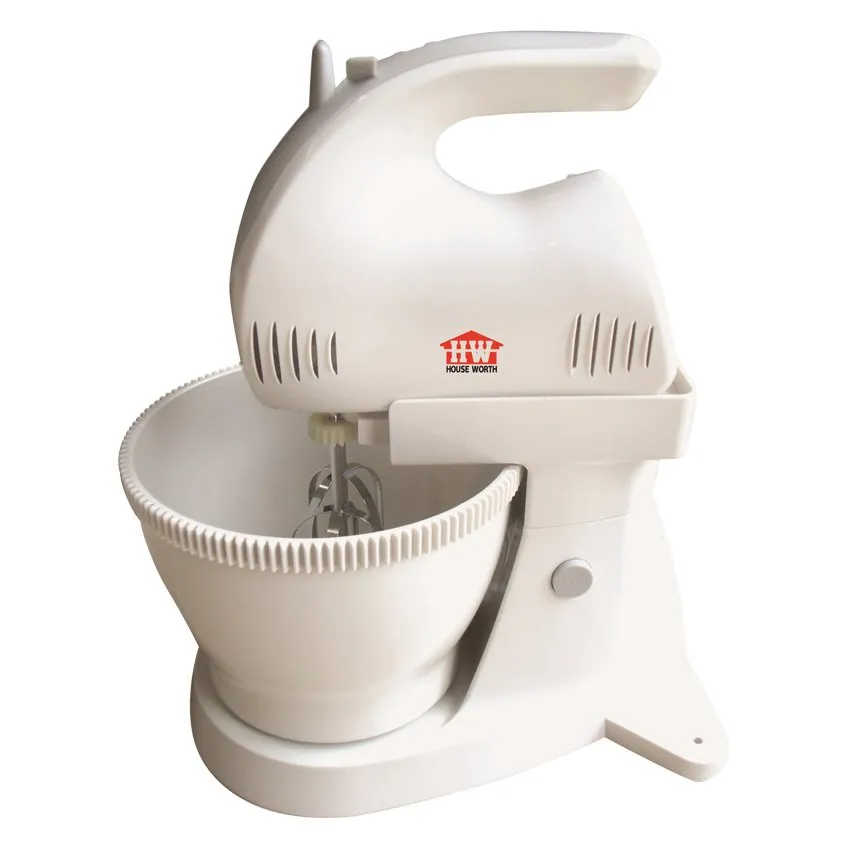 เครื่องตีไข่, House Worth เครื่องผสมอาหาร รุ่น HW-FM02 2.8 ลิตร ชนิดของเครื่องตีหรือเครื่องผสมอาหาร ถ้าเดินไปแผนกเครื่องใช้ไฟฟ้าแล้วมองหาเครื่องผสมอาหารจะพบว่ามีหลายยี่ห้อและมีหน้าตาหลายแบบมาก แต่ไม่ต้องตกใจหนึ่งเพราะไม่ว่าจะหน้าตาแบบไหน แต่สุดท้ายเครื่องผสมอาหารมีอยู่ไม่กี่ชนิด หนึ่งขอขอแบ่งตามลักษณะการใช้งาน มี 2 ชนิดคือ Hand mixer หรือเครื่องตีแบบมือถือ มีขนาดเล็ก น้ำหนักเบา ถือไปมาได้สะดวก จะมาแต่ตัวเครื่องและหัวตี ไม่มีโถผสมมาให้ หัวตีที่ให้มาแล้วแต่ยี่ห้อ แล้วแต่รุ่น บางรุ่นให้แค่อย่างเดียว บางรุ่นก็จัดเต็มหัวตีมาทุกแบบ มี blender แบบใบมีดมาให้ด้วยซึ่งแน่นอนว่าราคาก็จะสูงขึ้นด้วย รุ่นมือเดี่ยวตัวเล็กมาก เหมาะสำหรับตีฟองนมแบบเล็กๆ ที่ร้านกาแฟนิยมใช้ สามารถใช้ตีไข่ได้เหมือนกันแต่ต้องเป็นปริมาณน้อยๆ (ลองคิดถึงอาหารฝรั่งเศสที่เสิร์ฟมาแล้วมีฟองๆ ใช้ตัวนี้แหละค่ะตี) แบบกึ่งมือถือ ตัวนี้จริงๆแล้วคือ hand mixer ที่มีแท่นเพิ่มให้นั่นเอง เผื่อว่าไม่อยากถือตีตลอดเวลก็มีแป้นให้วางและมีโถตีให้ด้วย แถมมี option ให้เลือกด้วยว่าโถหมุนได้ หมุนไม่ได้ด้วย เครื่องตีแบบนี้เป็นเครื่องตีตัวแรกที่หนึ่งซื้อมาใช้ด้วย Stand Mixer หรือ เครื่องผสมแบบตั้งโต๊ะ เครื่องตีแบบนี้จะมาแบบ strong และแน่นมากค่ะ เครื่องมีขนาดใหญ่ น้ำหนักเยอะมาก วางแล้ววางเลย เคลื่อนย้ายไปมาลำบาก และราคาสูงกว่าสองแบบข้างต้น แต่จะมีกำลังมากกว่า ปรับความเร็วได้หลายระดับ มาพร้อมโถและหัวตีแบบต่างๆ ที่ออกแบบมาเฉพาะคือใช้ได้กับเครื่องนั้นเท่านั้น ราคาเครื่องตีแบบนี้มีตั้งแต่หลักหลายพันถึงหลายหมื่นแล้วแต่นี่ห้อ บ้านเรามีหลายยี่ห้อ เราแนะนำ