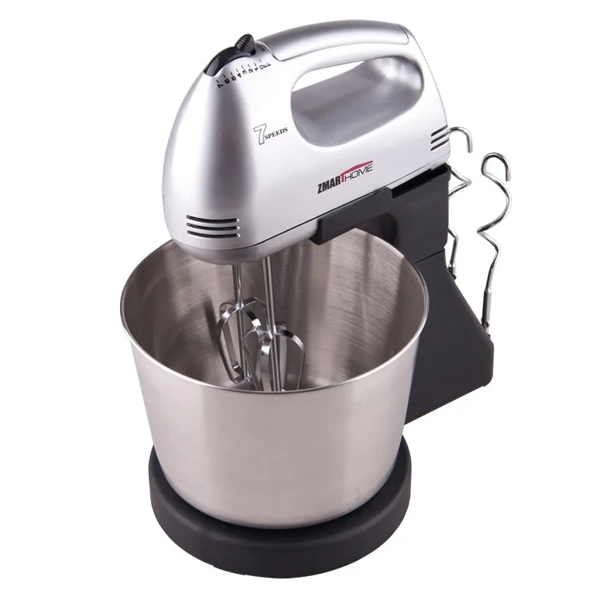 เครื่องตีไข่, Zmart home เครื่องผสมอาหาร รุ่น ZM-201S เครื่องตีหรือเครื่องผสมอาหาร เรียกแบบนี้อาจจะไม่ค่อยคุ้นหู แต่ถ้าหนึ่งเรียก “เครื่องตีไข่” ทุกคนต้องร้องอ๋อ แต่หนึ่งจะไม่เรียก “เครื่องตีไข่” เพราะความหมายเขาแคบไปอาจจะทำให้เข้าใจผิดกันได้ เพราะจริงๆแล้วเครื่องตีหรือเครื่องผสมอาหารใช้ทำอะไรได้หลายอย่างมากกว่าตีไข่และมีหลายแบบให้เลือกซื้อมา มือใหม่หัดอบขนมที่กำลังคิดหรือตัดสินใจอยู่ว่าอ่านก่อนตัดสินใจเลือกซื้อ โดยเขียนจากประสบการณ์การใช้งานเน้นทำกินเองในบ้าน ไม่รวมแบบทำเป็นอุตสาหกรรมว่ามีอะไรที่ควรรู้ก่อนเดินไปซื้อมาใช้และควรเลือกซื้อเครื่องผสม/เครื่องตีไข่แบบไหนดี ก่อนอื่นมารู้จักเจ้า “เครื่องตีหรือเครื่องผสมอาหาร” กันก่อนว่ามันคืออะไร เครื่องตีหรือเครื่องผสมอาหาร หรือ Mixer คืออะไร ใช้ทำอะไร เป็นเครื่องใช้ไฟฟ้าในครัวที่ใช้ผสมหรือตีส่วนผสมอาหารเข้าด้วยกันด้วยแรงจากมอเตอร์ สามารถปรับระดับความเร็วในการตีหรือการผสมได้หลายระดับแล้วแต่เครื่อง (เครื่องผสมอาหารหรือ mixer จะไม่มีการบดอาหาร ถ้ามีการบดอาหารจะอยู่ในกลุ่ม blender ที่มีหัวตีคล้ายใบมีด) mixer ในงานขนมอบเราใช้ตีไข่ ตีเมอแรง ตีวิปปิ้งครีม ตีเนย ตีส่วนผสมของเค้ก(cake batter) หรือแม้ผสมแป้งโดสำหรับทำคุกกี้หรือเพสทรีต่างๆ เราแนะนำ